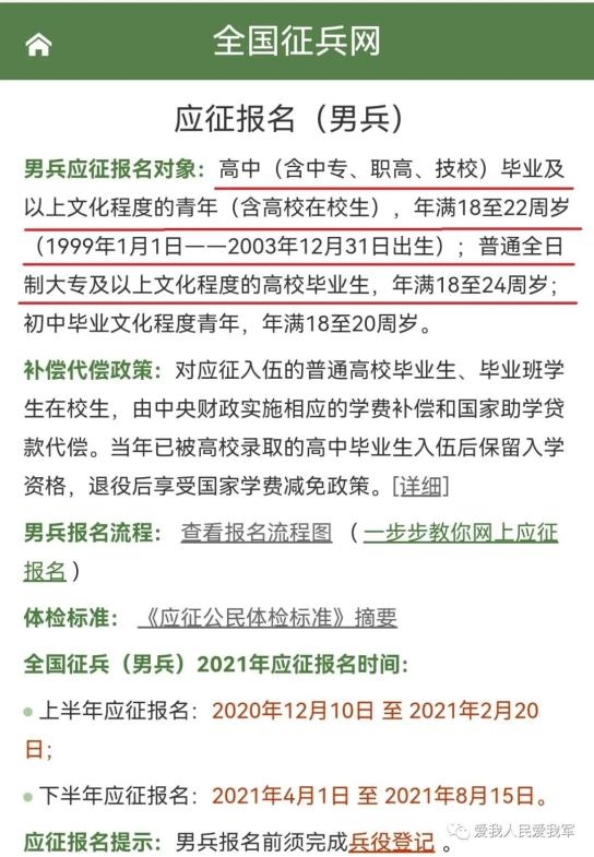 根据全国征兵网最新消息,今年下半年大学生应征报名年龄由往年18-24周岁调整为全日制大学毕业生18-24周岁,非全日制大学生为18-22周岁。这意味着,只有全日制大学毕业生应征报名年龄可放宽至24周岁,而全非日制大学生只能是最大到22周岁。