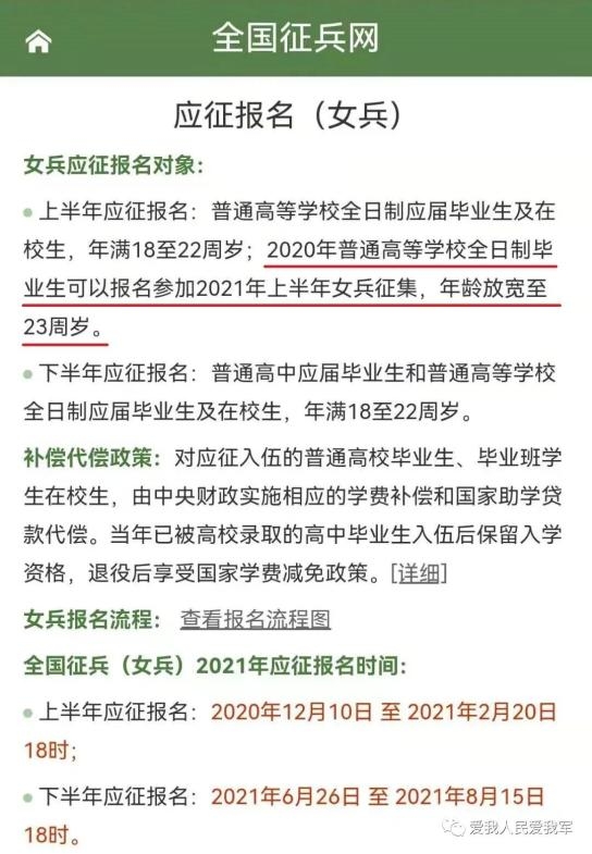 二是2020年普通高等学校全日制应届毕业生可报名参加2021年上半年女兵征集,年龄放宽至23周岁。以往只招收应届毕业生,这个条件的调整,可以说给了往届毕业生很大的空间,上半年女兵征集中也出现很多有意思的现象:比如,我们此前的报道女教师、女护士甚至女公务员参加入伍,这在此前是不可能的。