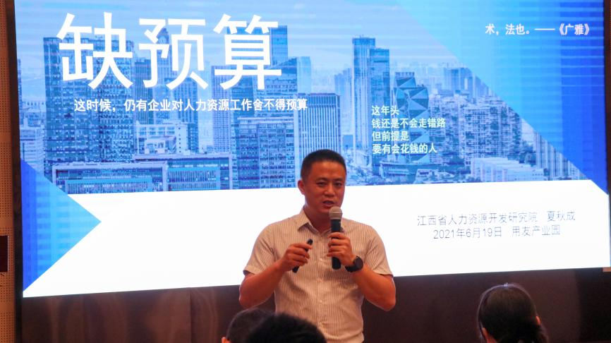 活动开场前,用友(南昌)产业园园区经营部经理宋莹女士首先对与会人员表达了热烈的欢迎。随即,本次沙龙主讲嘉宾:聚才人力集团董事长夏秋成先生从大背景下中小企业面临的转型中的问题,从人力资源的战略、战术层面展开了全面的经验分享。