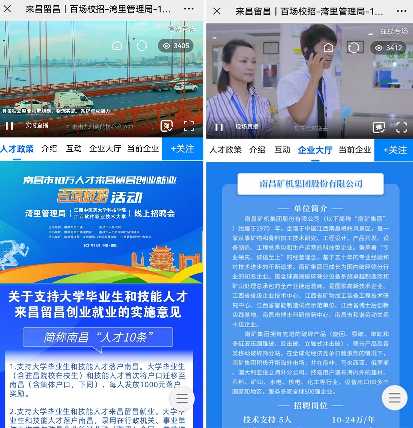 此外,11月16日,由南昌湾里管理局,江西软件职业技术大学联合举办,江西人才招聘网承办的南昌市10万大学生和技能人才来昌留昌创业就业“百场校招”湾里管理局空中双选会同步上线了50家企业,2152个待招岗位,当天吸引到237人次浏览,收到简历226份,初步达成就业意向12人。